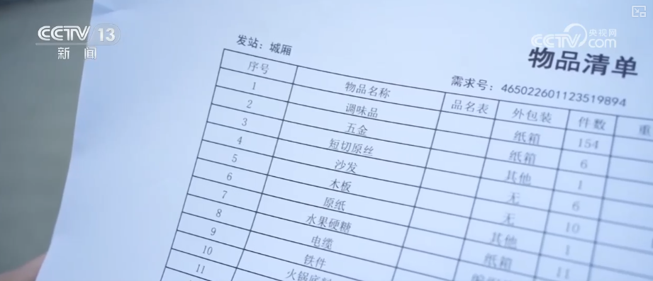 通过一夜繁忙,上午九点多,满载着26个集装箱、100多种货品的X8658次货运班列从站台动身奔向大湾区。这一叠是这趟班列的物品清单,仅一个集装箱里就有五金、电缆、铁件等大件,还有火锅底料和新鲜蔬菜。
